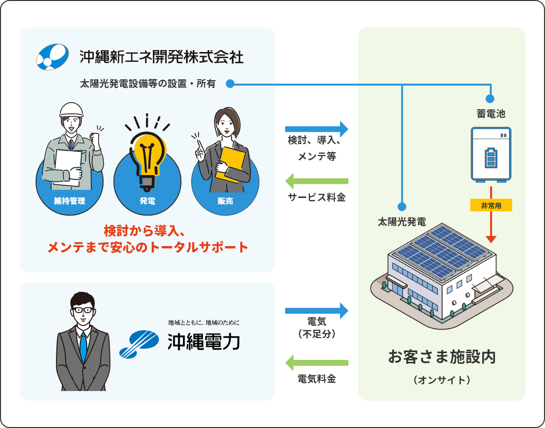 お客さまの施設に、おきでんグループ所有の『太陽光発電設備』と『蓄電池』をお客さまの初期費用負担ゼロで設置し、発電した電気をお客さまにご利用いただくサービスで、検討から導入、アフターフォローまで、おきでんグループがワンストップで対応します。